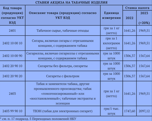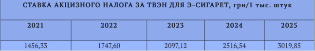 Табак для электронных сигарет (согласно пунктам 215.3.2 НКУ и пункту 17 подраздела 5 Переходных положений НКУ). Официально это изделие определяется как табачное изделие для электрического нагрева (ТВЭН) с кодом УКТ ВЭД 2403 99 90 10. Ставка акциза на этот товар будет расти ежегодно на 20% к 2025 году, при этом в 2024 году она составляет 209 .