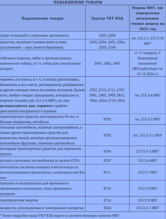 Нынешний список подакцизных продуктов представлен в таблице ниже.