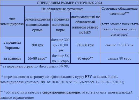 - Суточные начислены выше установленной нормы, которая на 2024 год составляет более 710 гривен в день в Украине или 80 евро за границей.