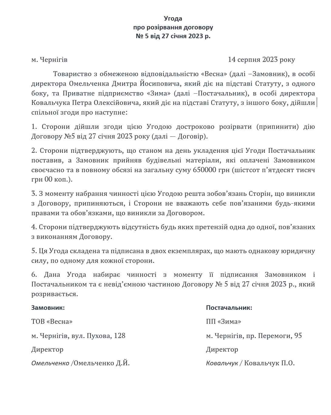 Пример: ООО "Весна" (покупатель) и ООО "Зима" (поставщик) подписали письменный договор поставки товаров на два года в январе 2023 года. Однако в августе 2023 года ООО "Весна" решило расторгнуть договор по собственной инициативе. Дополнительное соглашение о расторжении договора аренды должно быть составлено следующим образом.