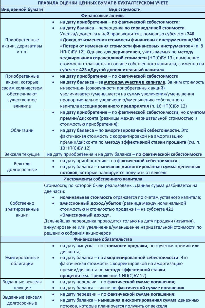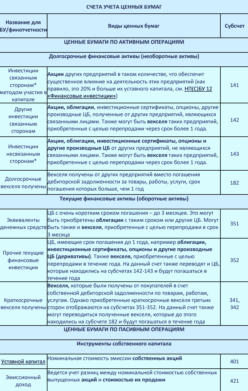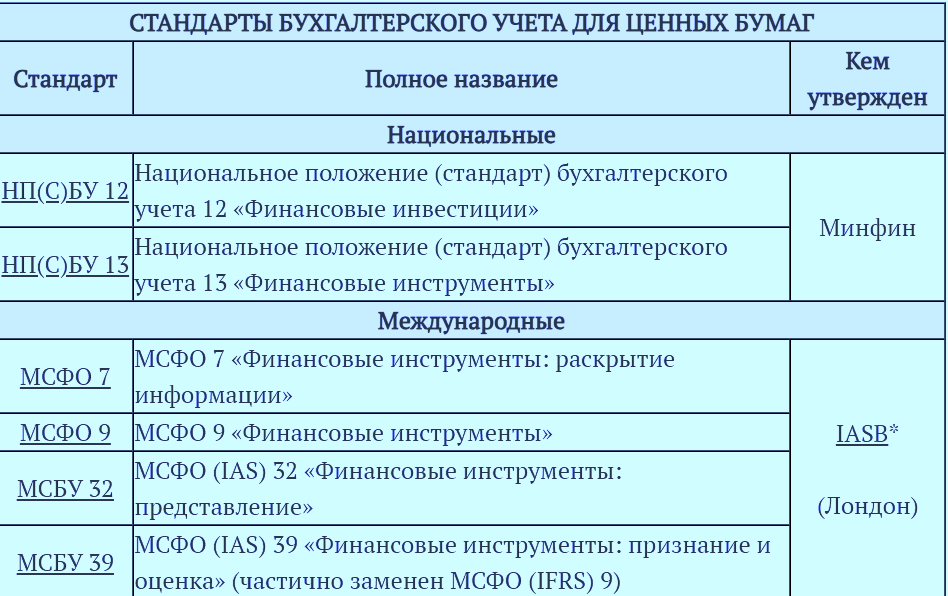 Учет ценных бумаг регулируется рядом разных стандартов бухгалтерского учета, приведенных в таблице ниже. Правила налогового учета описаны в следующих разделах: 14.1.45 пп. 196.1.1.1 и п. 141.2 Налогового кодекса Украины.