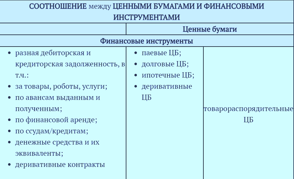 Однако ценные бумаги и финансовые инструменты – это не одно и то же. Финансовые инструменты не включают в себя торговые ценные бумаги. Это связано с тем, что торговые ценные бумаги не обмениваются финансовыми активами, финансовыми обязательствами или инструментами собственного капитала. В то же время финансовые инструменты включают дебиторскую и кредиторскую задолженность за товары, работы и услуги, обязательства по финансовой аренде и денежные средства. Взаимосвязь между этими понятиями показана в таблице ниже.