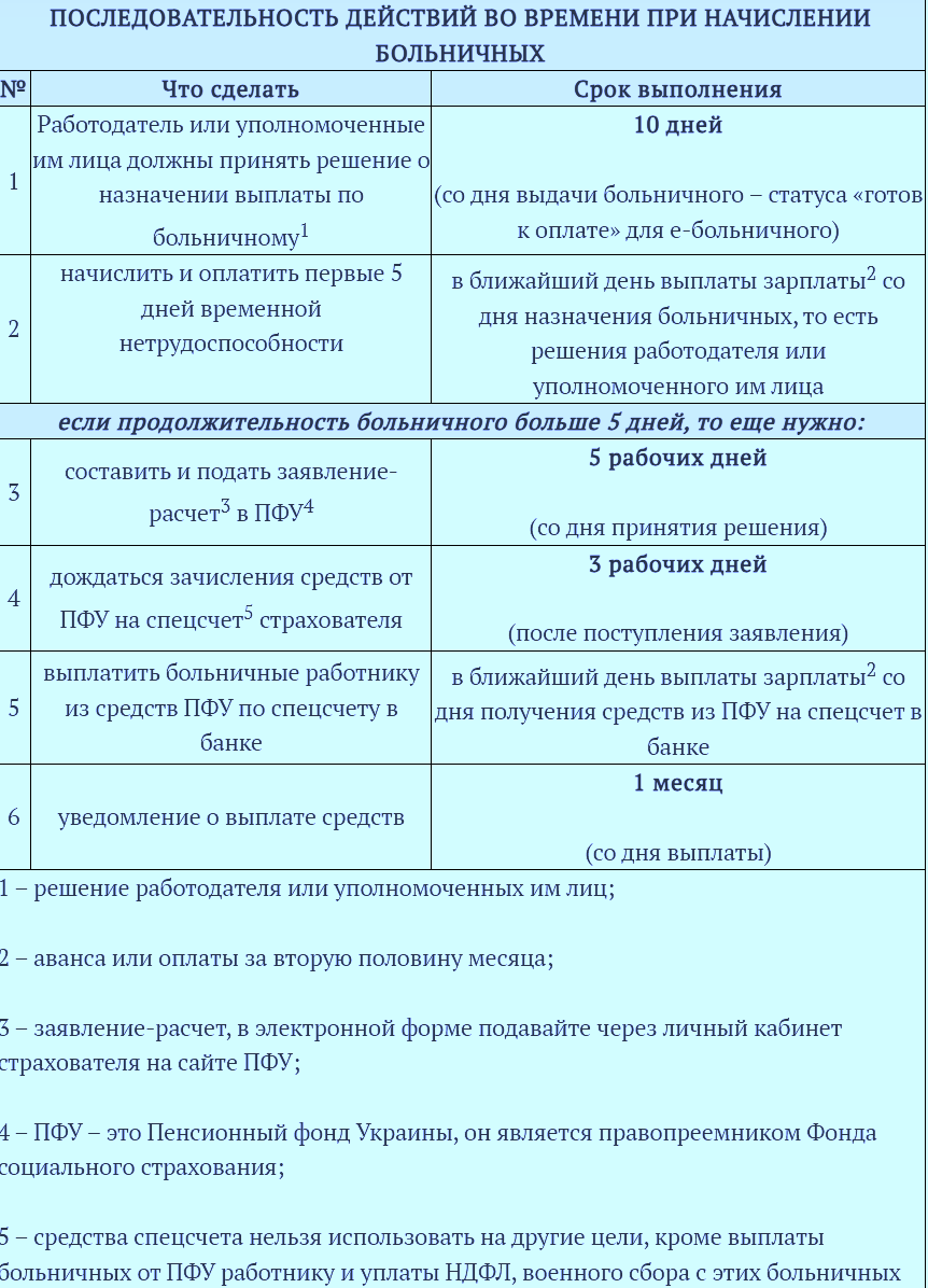 После выдачи электронного листа нетрудоспособности у медицинского работника есть время начисления и оплаты больничных. Последовательность действий показана в таблице ниже.