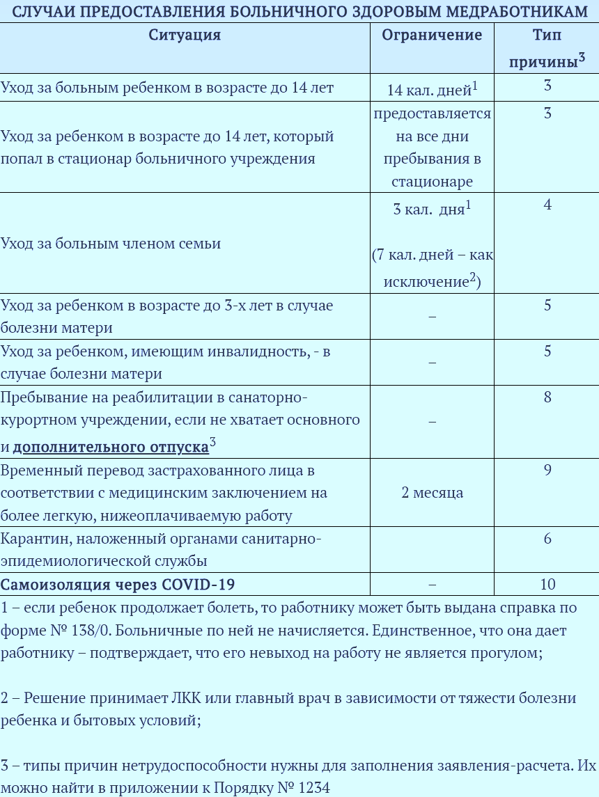 Больничный также может предоставляться здоровым работникам, работающим в организации здравоохранения. Таблица ниже иллюстрирует следующие случаи. Наиболее распространен электронный листок нетрудоспособности по пункту "3", который выдается на основании медицинского листка нетрудоспособности, зарегистрированного лечащим врачом (Порядок № 1234, абзац 2, подпункт 6 "3").