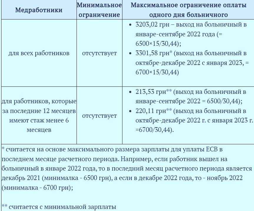 Если страховой стаж за последние 12 месяцев составляет менее шести месяцев (например, если медработник работал на 0,25 ставки или отсутствовал на работе длительное время), к пособию по временной нетрудоспособности применяется предельный размер исходя из минимальной заработной платы в месяце, в котором медработник взял больничный. Это означает, что если медицинский работник возьмет больничный в период с октября 2022 по апрель 2023 года, его среднедневная заработная плата будет меньше 220,11 грн (= 6700/30,44).