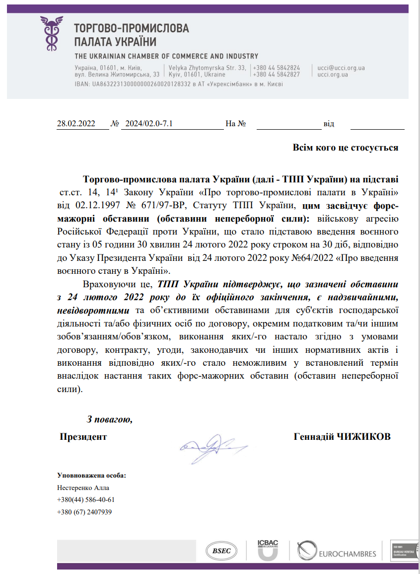 Учитывая, что не все субъекты хозяйствования могут обратиться в ТПП в период полномасштабного вторжения, ТПП Украины издала общее официальное письмо № 2024/2.0-7.1 от 28 февраля 2022 годао доказывании форс-мажорных обстоятельств. Пожалуйста, ссылайтесь на это письмо при информировании своих партнеров о наступлении форс-мажорных обстоятельств.