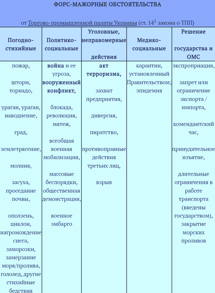 Форс-мажорные обстоятельства определены статьей 14(1) Закона о Торгово-промышленной палате. Однако для целей договора эта статья не считается исчерпывающей и обязательной, поскольку стороны могут сами определить обстоятельства, составляющие форс-мажорные обстоятельства. Если в договоре это не определено, то можно руководствоваться ч. 1 ст. 14 Закона о ТПП. Для удобства эти форс-мажорные происшествия разделены на зоны пришествия в таблице ниже.