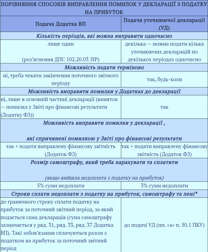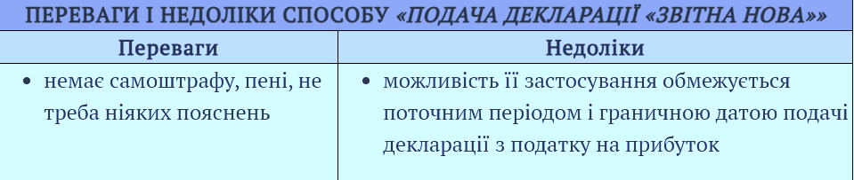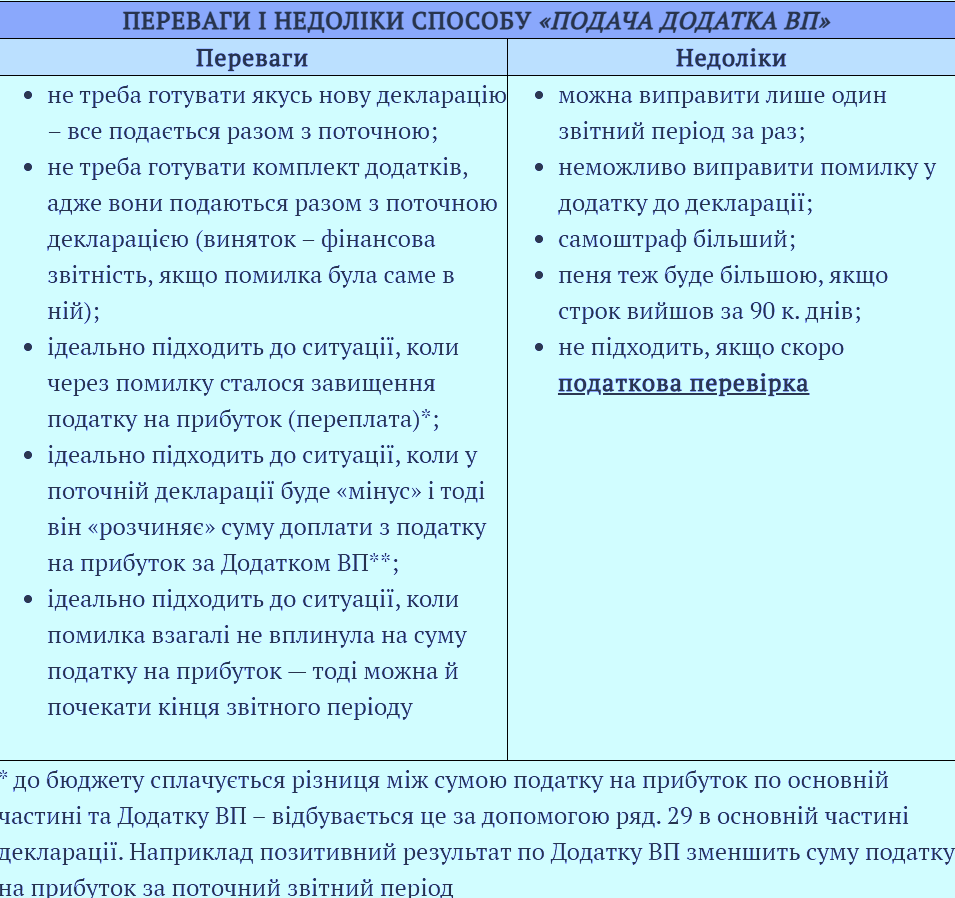 Исправление ошибок через Дополнительный ОП осуществляется путем "удаления" данных ложной декларации. Другими словами, если финансовый результат до налогообложения в ошибочной декларации составляет 150 000 грн., а в уточняющем расчете – 75 000 грн., то правильными считаются последние 75 000 грн. В то же время, если такая ошибка связана с некорректной финансовой отчетностью, эту отчетность также следует подать, а в Приложении ОП сделать отметку, в какой форме и по каким критериям была представлена финансовая отчетность (таблица 3 в Приложении ОП). В приложении к декларации вы также можете объяснить, какую именно финансовую отчетность вы представляете и почему. В следующей таблице обобщены преимущества и недостатки исправления ошибок через Приложение ОП к декларации.