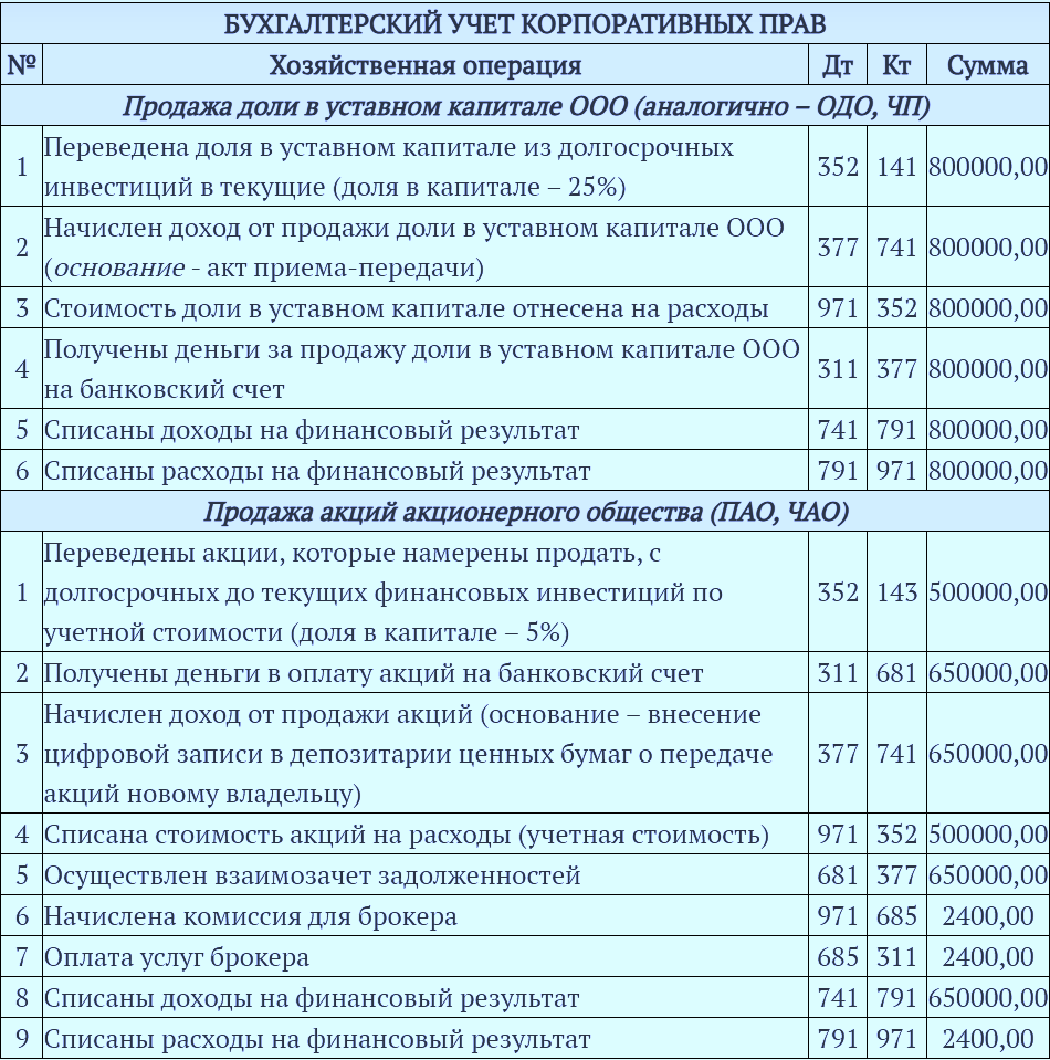 Проводки для продажи акций компании