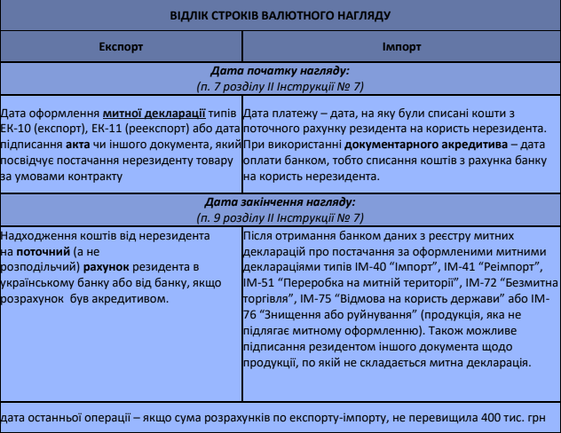 - Инструкция о порядке валютного надзора банков за соблюдением резидентами предельных сроков расчетов по операциям по экспорту и импорту товаров, постановление правления НБУ от 02.01.2019 г. № 7 (далее – Инструкция № 7).