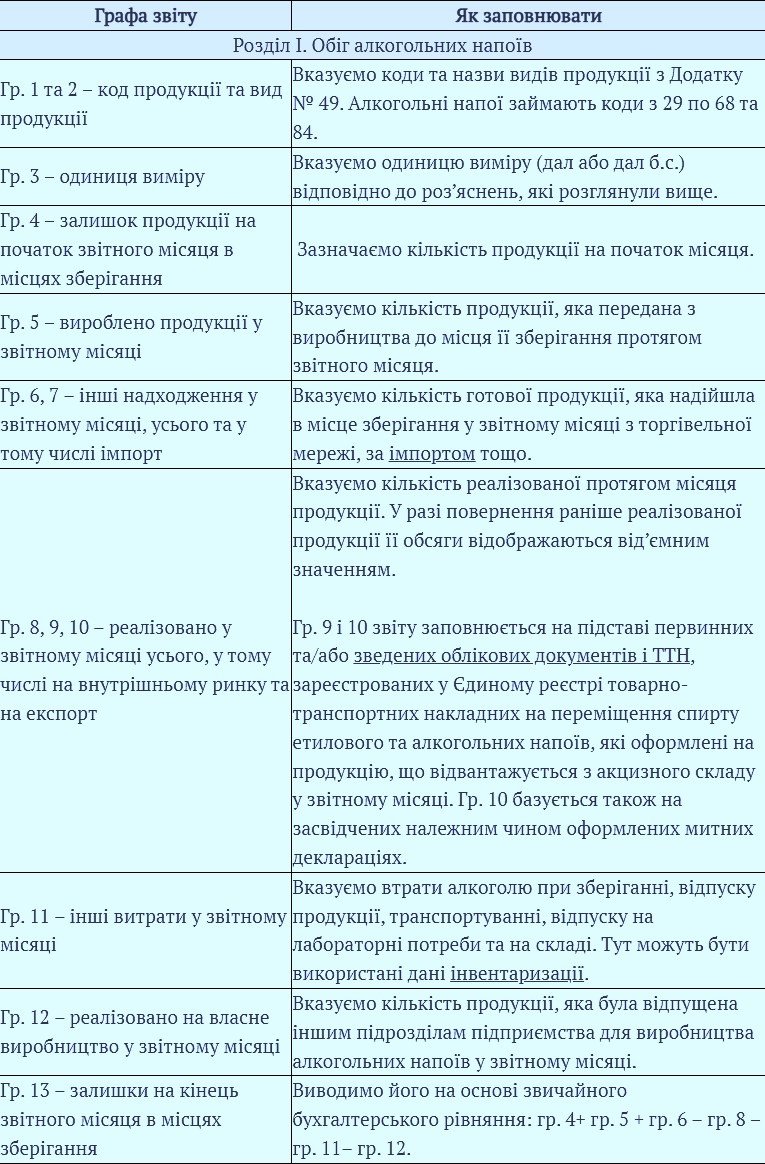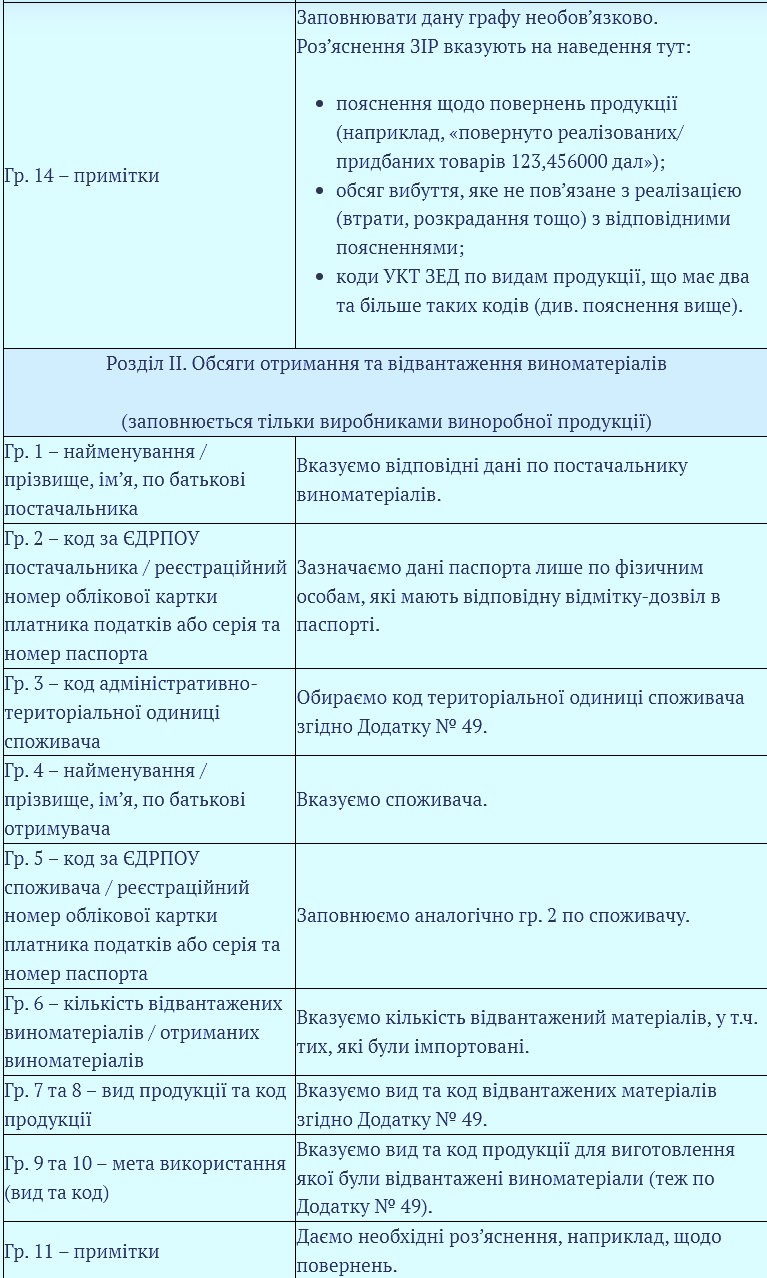 - Согласно УКТВЭД, для типов товаров, имеющих более одного кода, следует выделять более одной строки. Это касается видов продукции с кодами 32-37, 43-46, 57 и 67 в Приложении 49. Поскольку отчет не имеет отдельной колонки для перечня кодов УКТВЭД, для таких "двойных" или "тройных" продуктов эти коды следует указывать в примечаниях (часть И, колонка 14). Например, коньяк имеет один код 67 согласно Приложению № 49, но два кода УКТВЭД: 22082012 и 22082062 (в зависимости от емкости тары). Поэтому код УКТ ВЭД для коньяка следует указывать в поле примечаний;