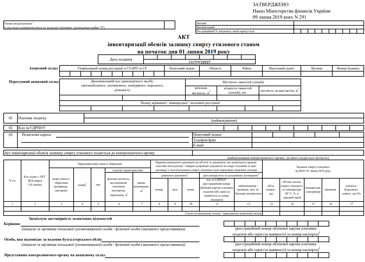 Повна назва бланку: Акт інвентаризації обсягів залишку спирту етилового станом на початок дня 01 липня 2019 року