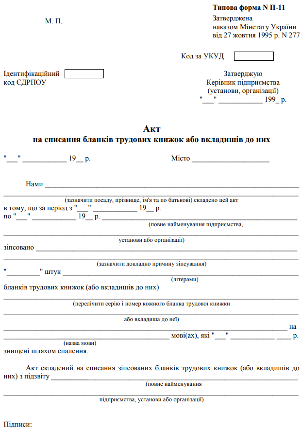 Повна назва бланку: Акт на списання бланків трудових книжок або вкладишів до них (форма № П-11).