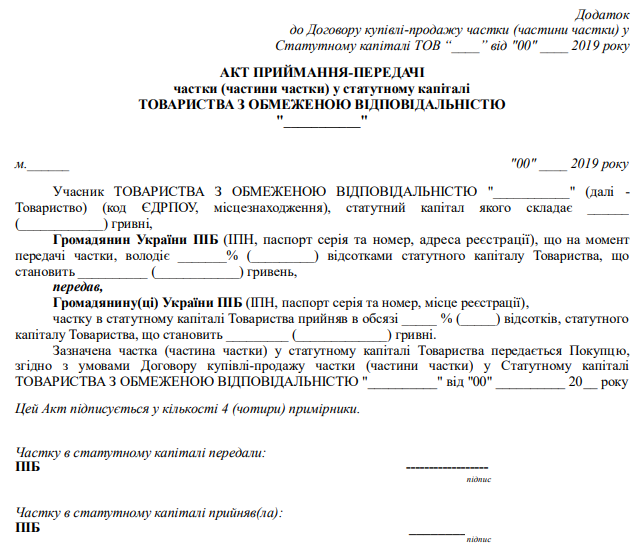 Повна назва бланку: Акт приймання-передачі частки (частини частки) у статутному капіталі.