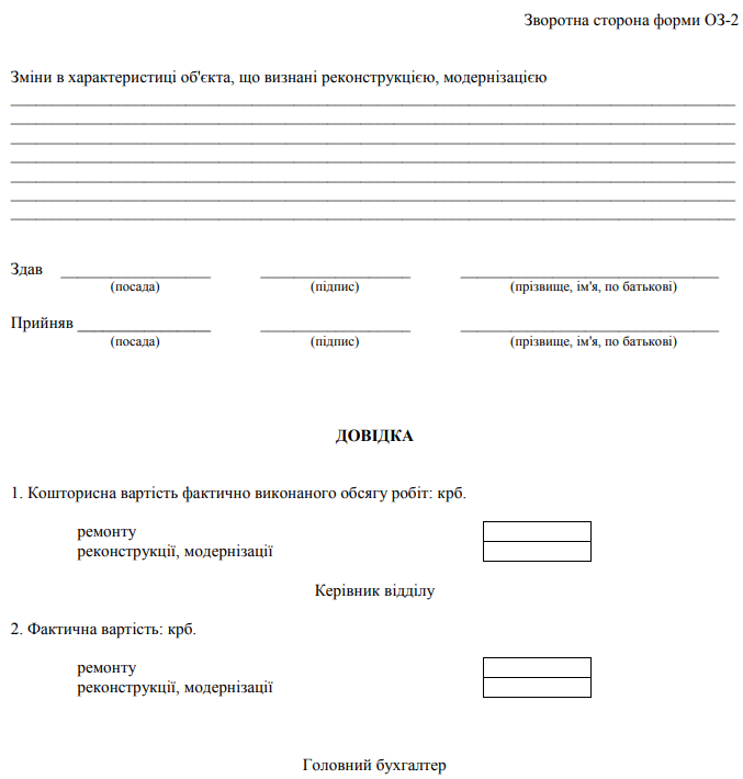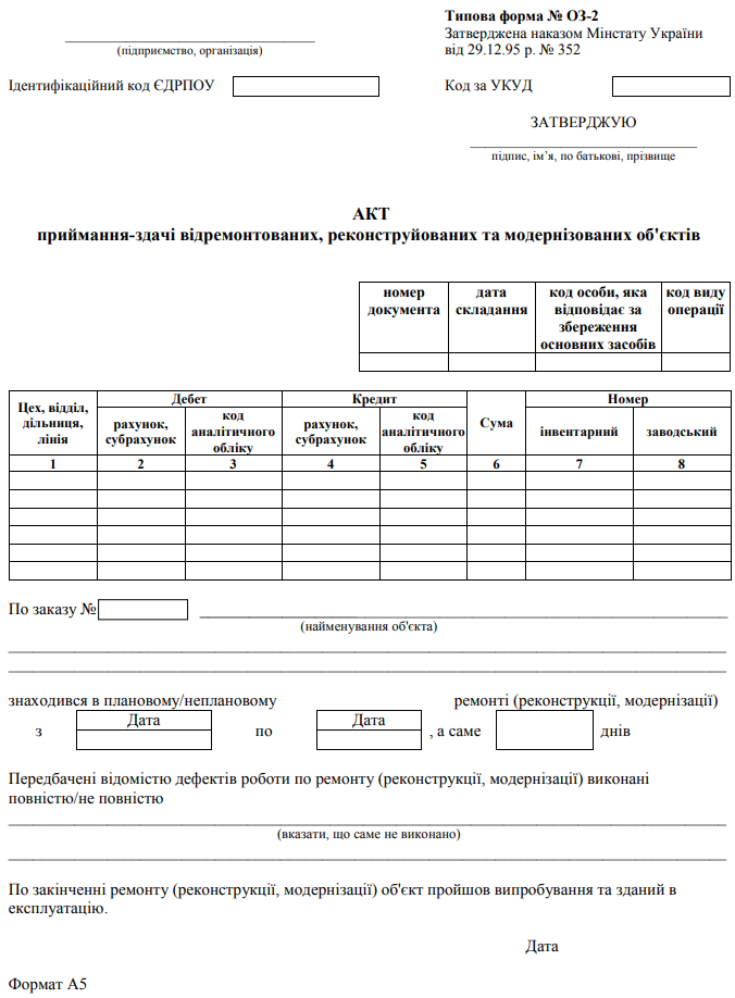 Повна назва бланку: Акт приймання-здачі відремонтованих, реконструйованих та модернізованих об'єктів (форма №ОЗ-2).