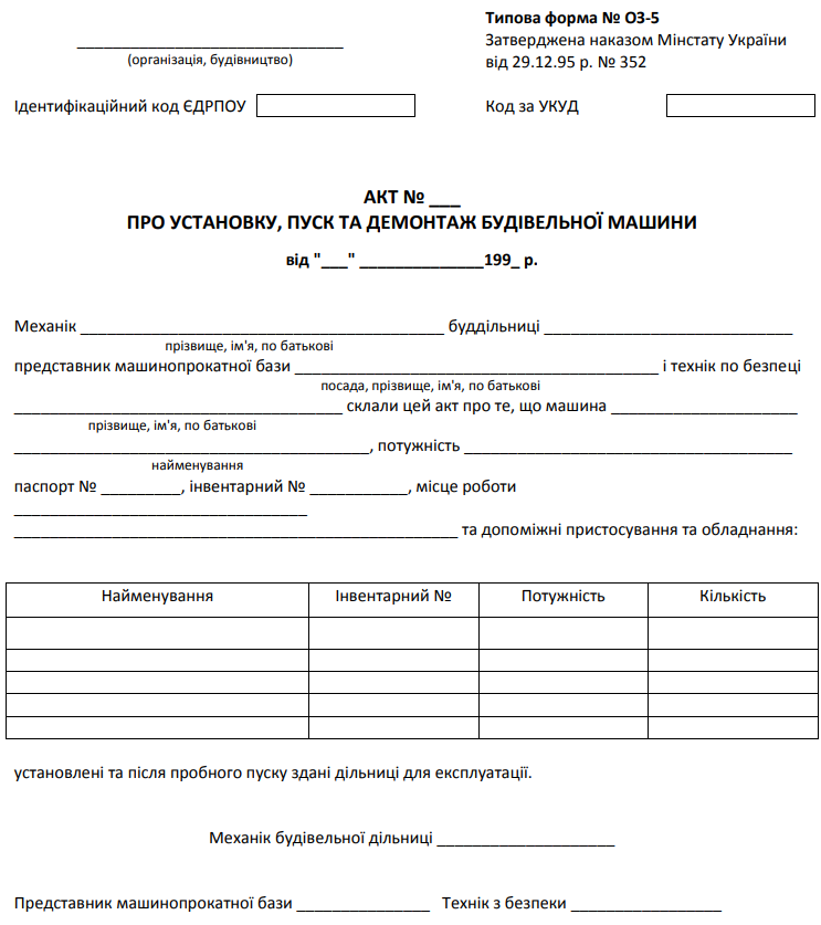 Повна назва бланку: Акт про установку, пуск та демонтаж будівельної машини (типова форма № ОЗ-5).