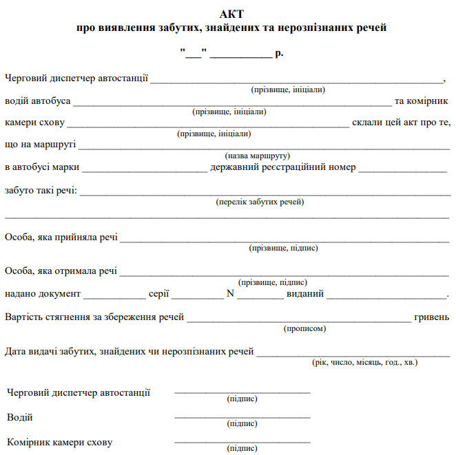 Затверджено бланк "Акт про виявлення забутих, знайдених та нерозпізнаних речей"