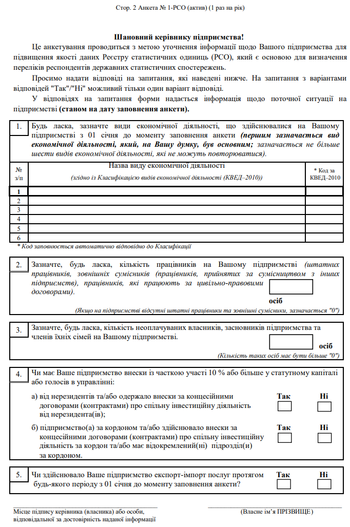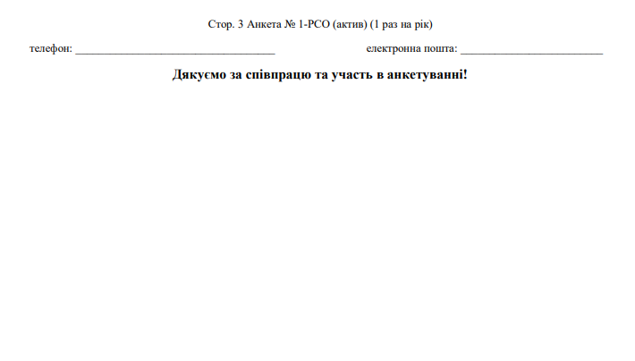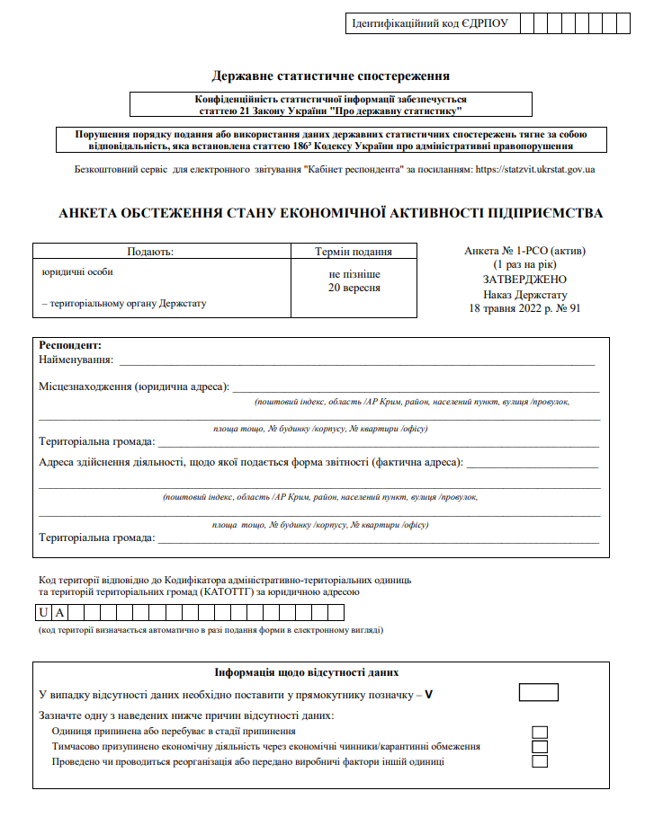 Повна назва бланку: Анкета обстеження стану економічної активності підприємства (Анкета №1-РСО (актив)).
