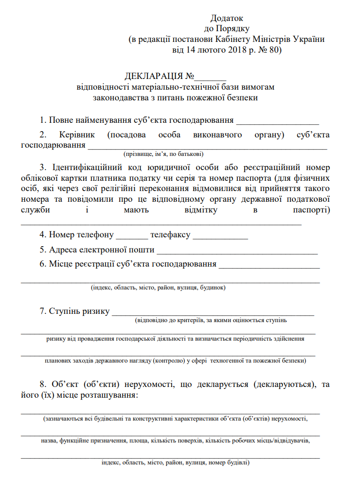 Повна назва бланку: Декларація відповідності матеріально-технічної бази вимогам законодавства з питань пожежної безпеки.