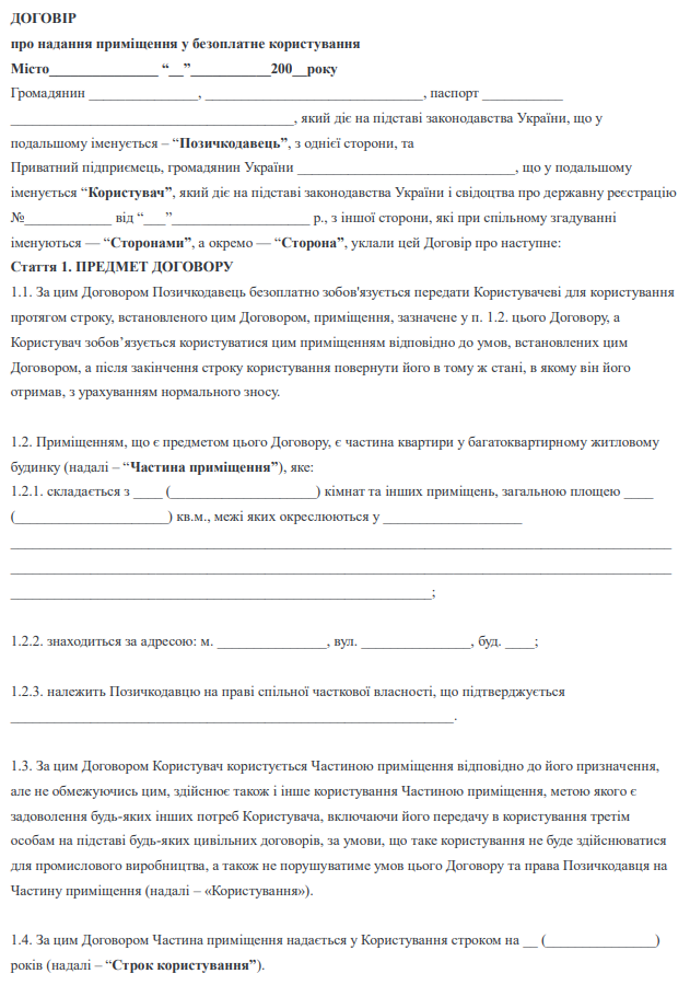 Повна назва бланку: Договір безоплатного користування приміщенням.