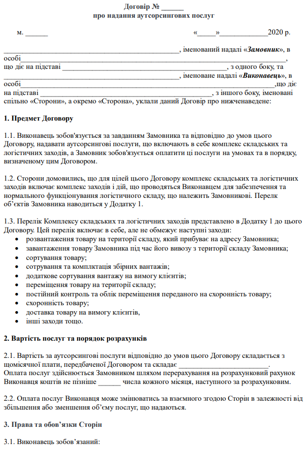 Повна назва бланку: Договір про надання аутсорсингових послуг.