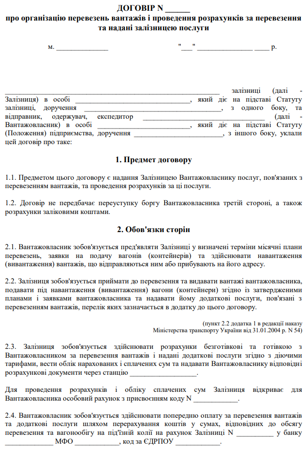 Повна назва бланку: Договір про організацію перевезень вантажів і проведення розрахунків за перевезення та надані залізницею послуги.