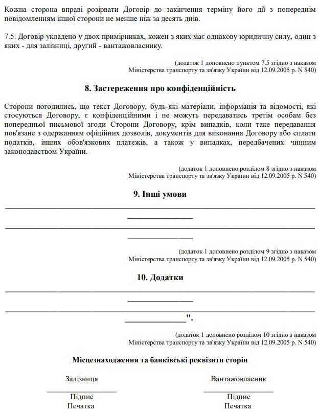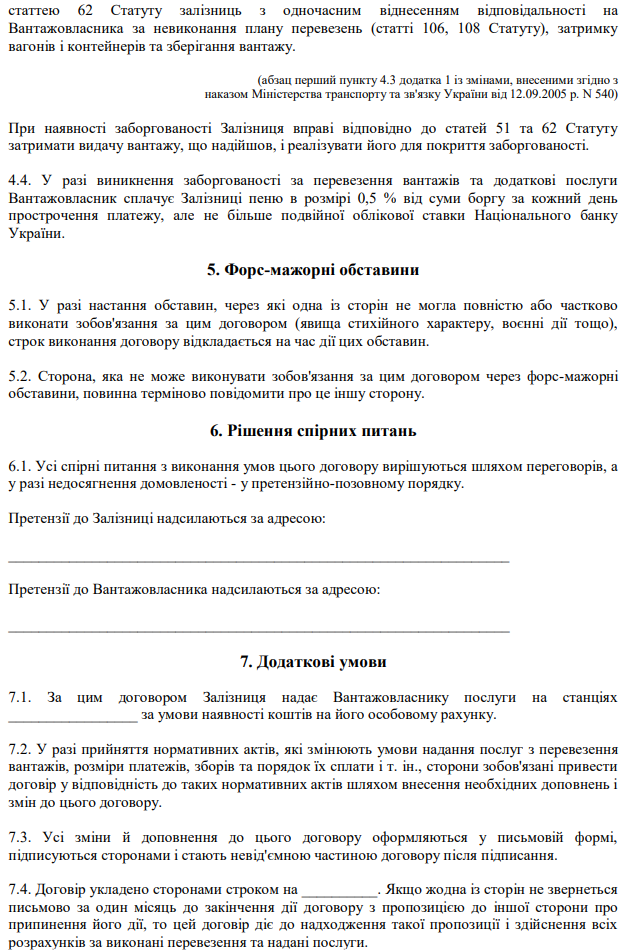 Завантажити бланк: "Договір про організацію перевезень вантажів залізницею"
