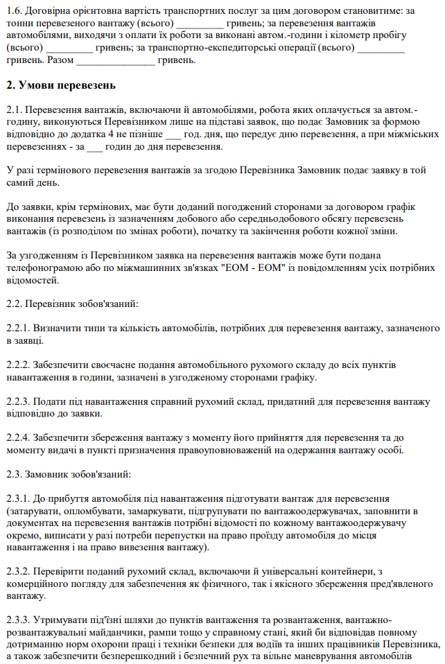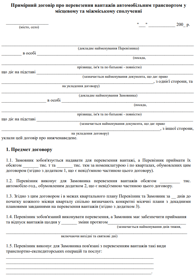 "Договір про перевезення вантажів автомобільним транспортом у місцевому та міжміському сполученні" зразок