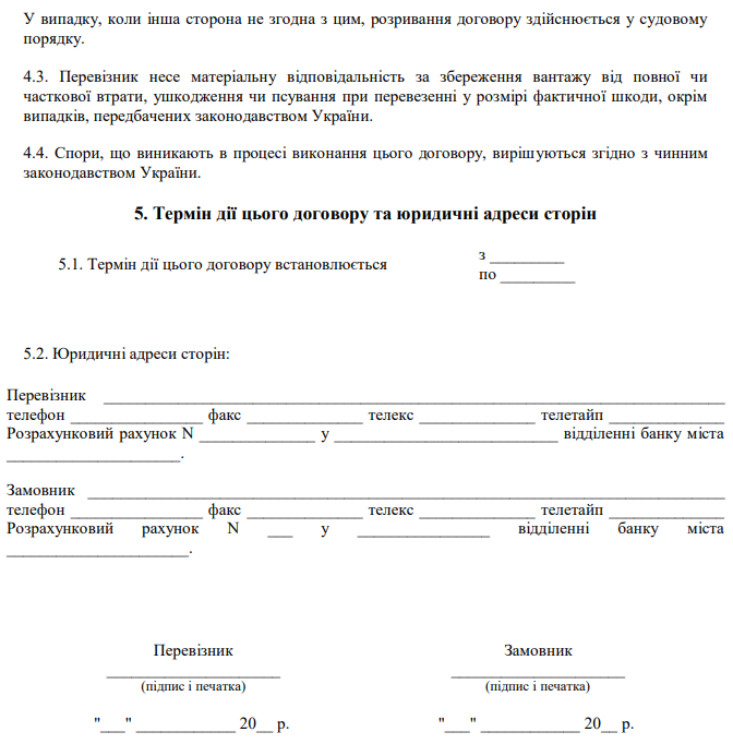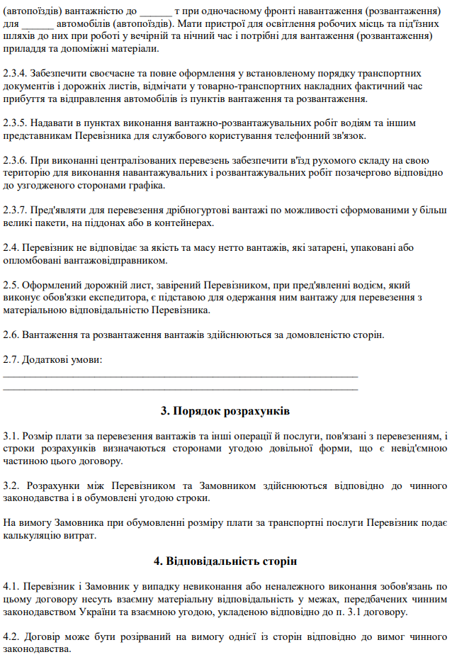 Завантажити бланк: "Договір про перевезення вантажів автомобільним транспортом у місцевому та міжміському сполученні"