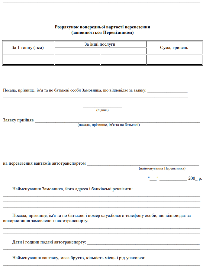 Повна назва бланку: Договір про перевезення вантажів автомобільним транспортом у місцевому та міжміському сполученні.