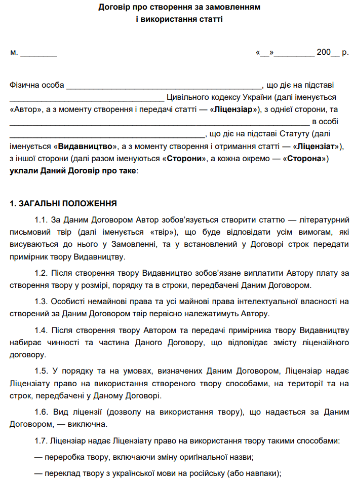 Завантажити бланк: "Договір про створення за замовленням і використання статті"