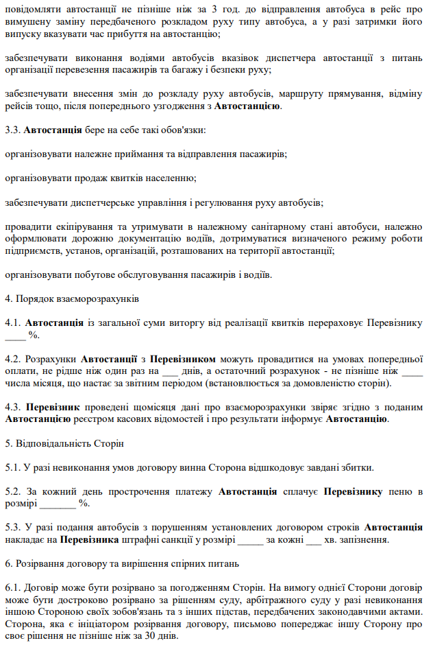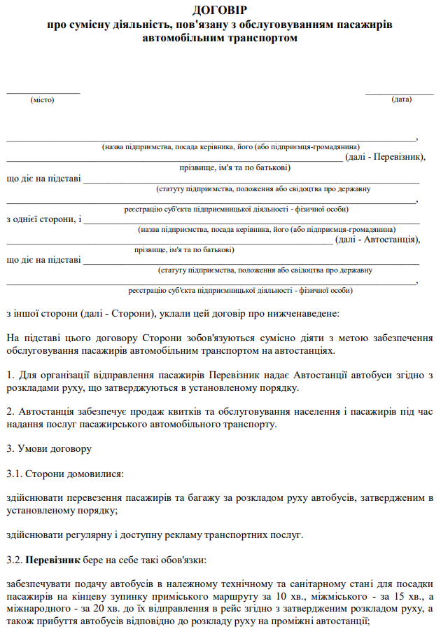 Повна назва бланку: Договір про сумісну діяльність, пов'язану з обслуговуванням пасажирів автомобільним транспортом.