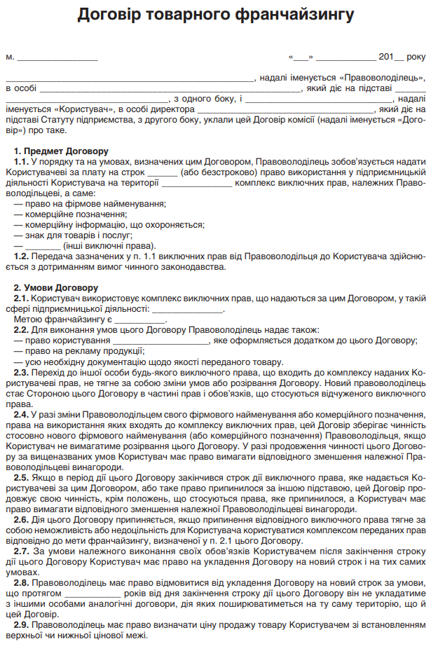 Повна назва бланку: Договір товарного франчайзингу.