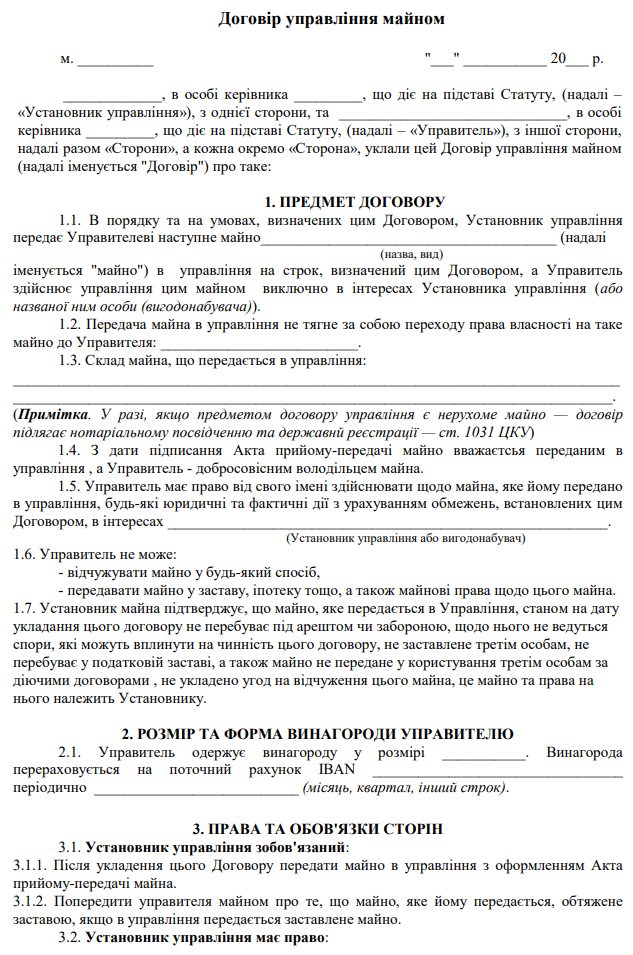 Завантажити бланк: "Договір управління майном"