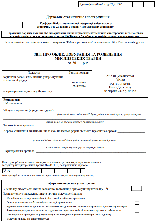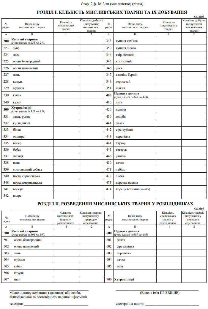 Повна назва бланку: Звіт про облік, добування та розведення мисливських тварин (форма №2-тп (мисливство) (річна)).