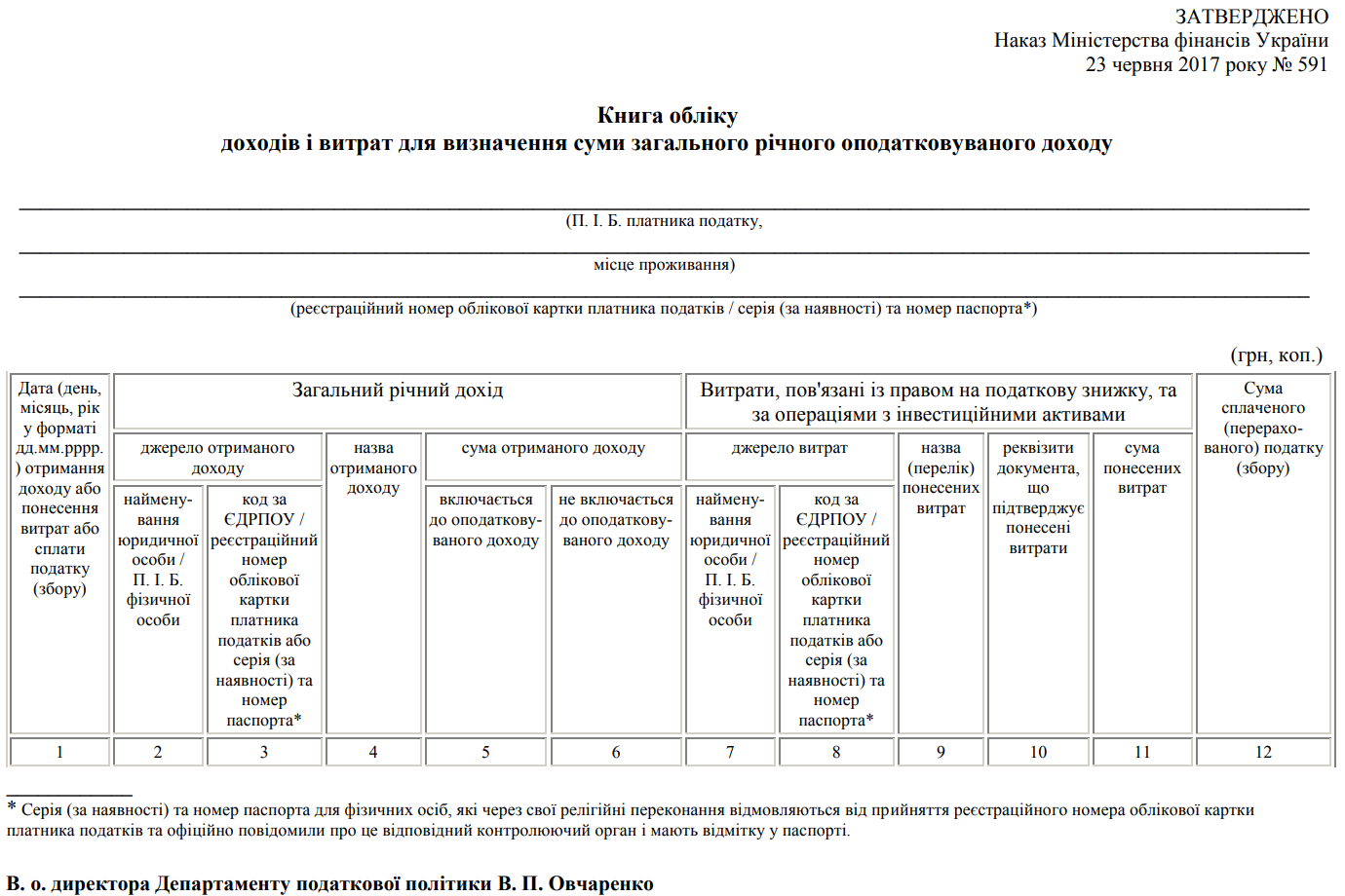 Повна назва бланку: Книга обліку доходів і витрат для визначення суми загального річного оподатковуваного доходу
