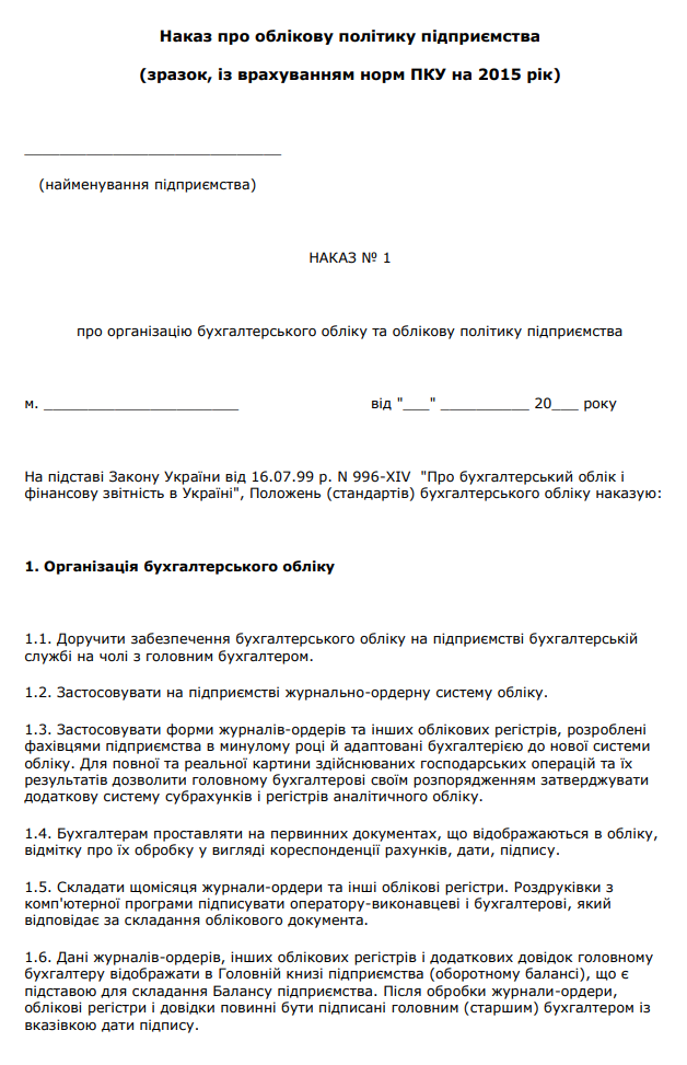 Завантажити бланк: "Наказ про облікову політику підприємства"
