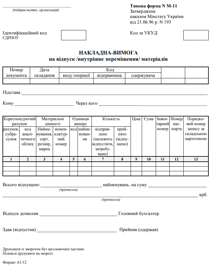 Повна назва бланку: Накладна-вимога на відпуск (внутрішнє переміщення) матеріалів (форма №М-11).
