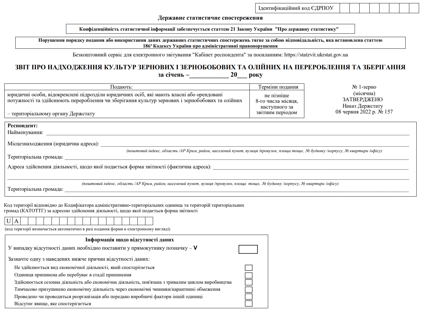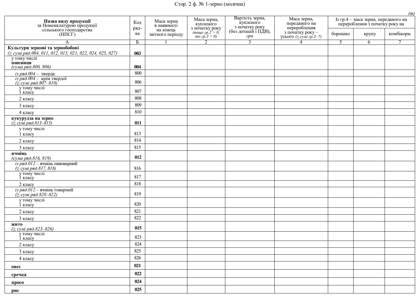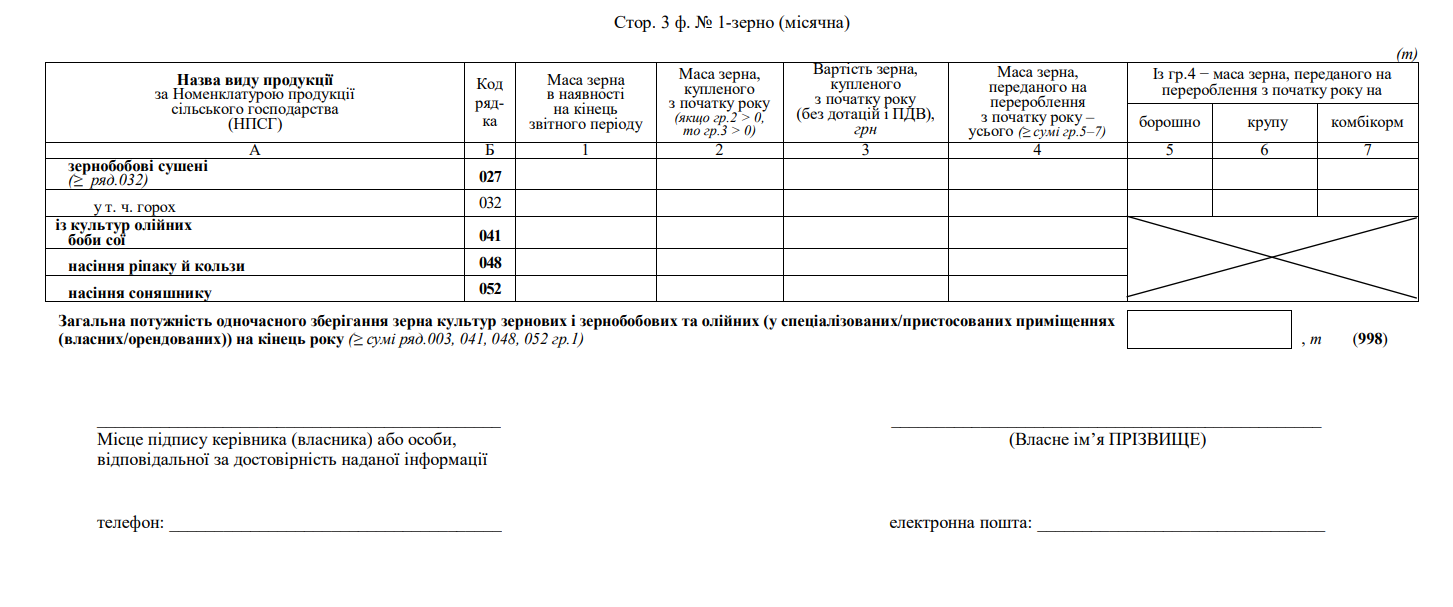 Повна назва бланку: Звіт про надходження зернових та олійних культур на перероблення та зберігання (ф. №1-зерно (місячна)).