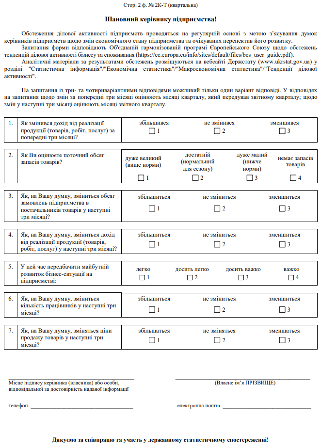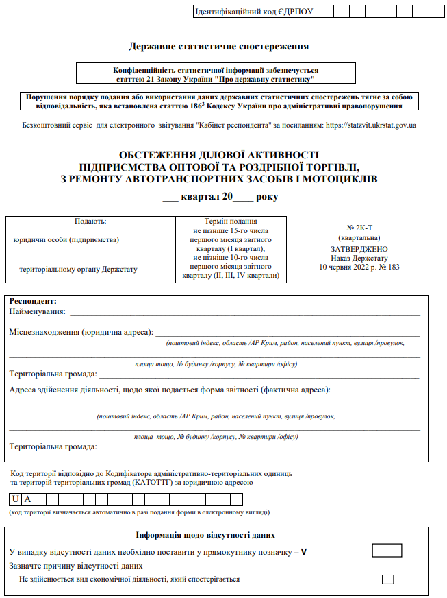 Повна назва бланку: Обстеження ділової активності підприємства оптової та роздрібної торгівлі, з ремонту автотранспортних засобів і мотоциклів (форма №2К-Т).
