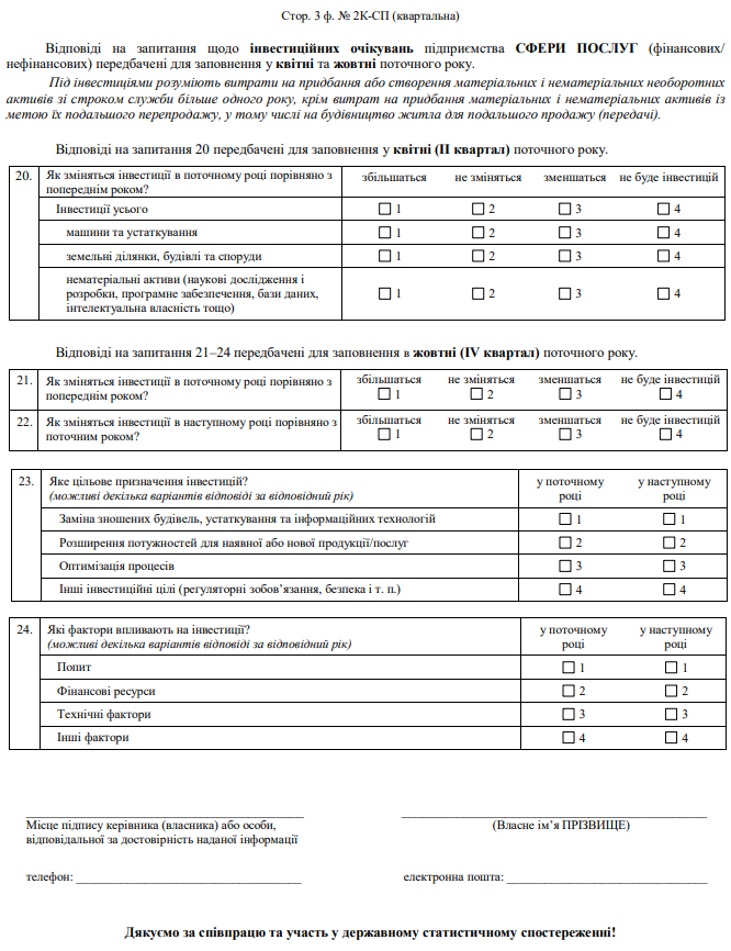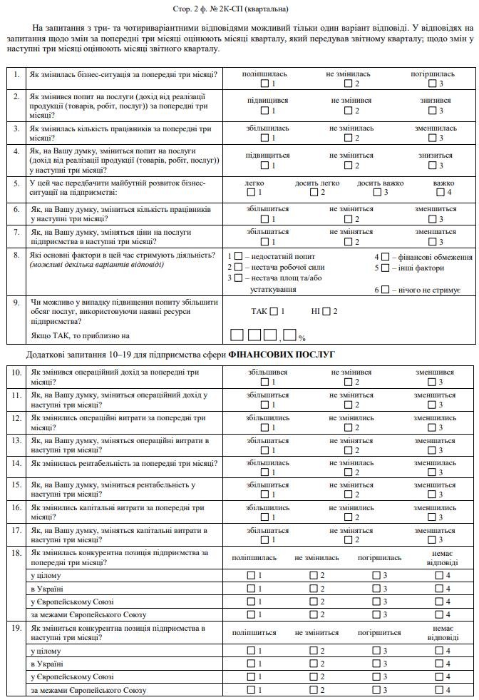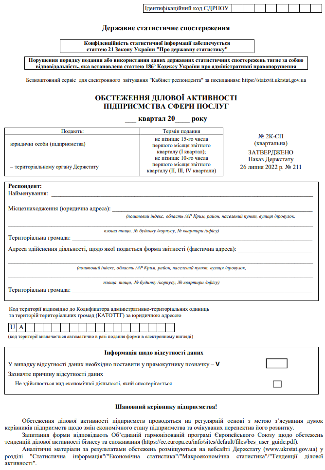 Повна назва бланку: Обстеження ділової активності підприємства сфери послуг (форма №2К-СП).