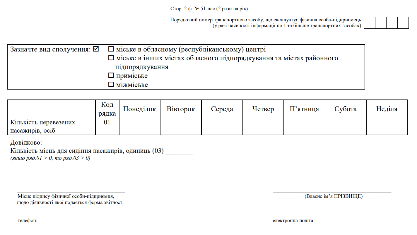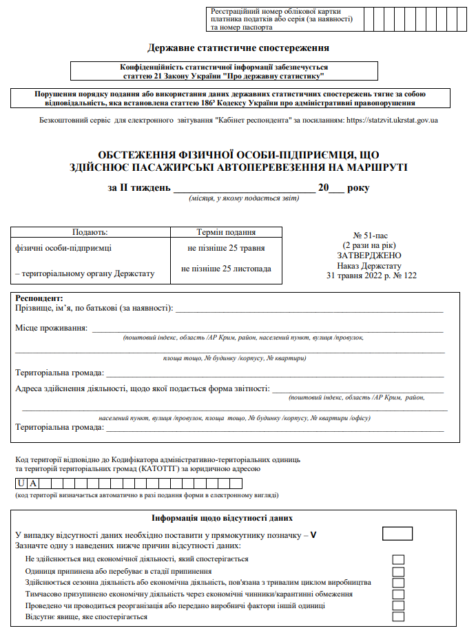 Повна назва бланку: Обстеження фізичної особи-підприємця, що здійснює пасажирські автоперевезення на маршруті (форма №51-пас).