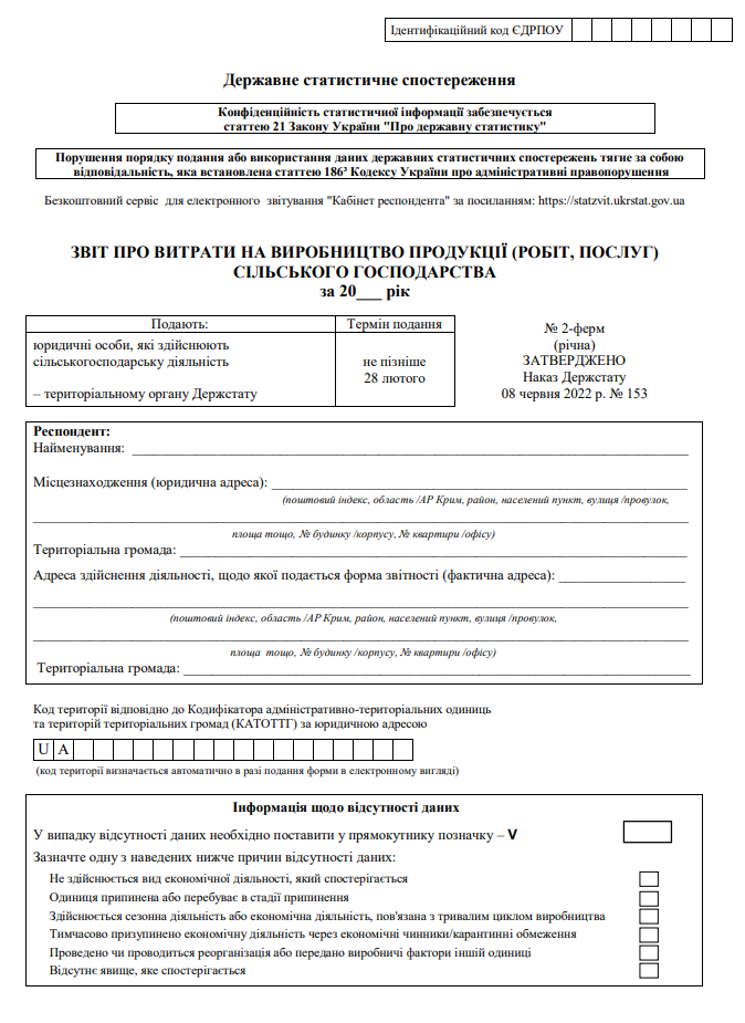 Повна назва бланку: Основні показники господарської діяльності фермерського господарства, малого підприємства у сільському господарстві за 20__ рік (форма №2-ферм).