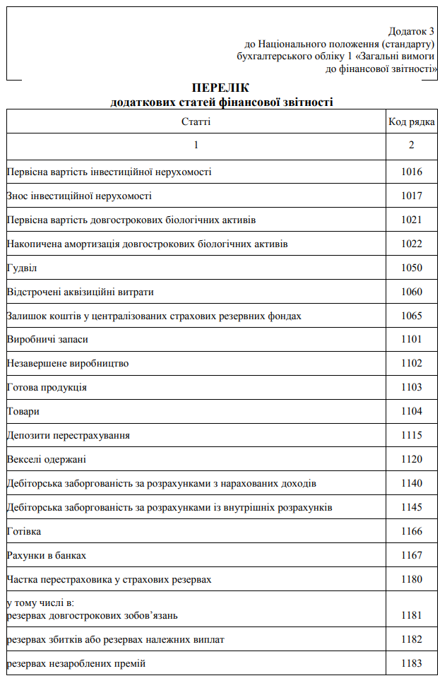 Повна назва бланку: Перелік додаткових статей фінансової звітності (Додаток 3 до НП(С)БО №1)