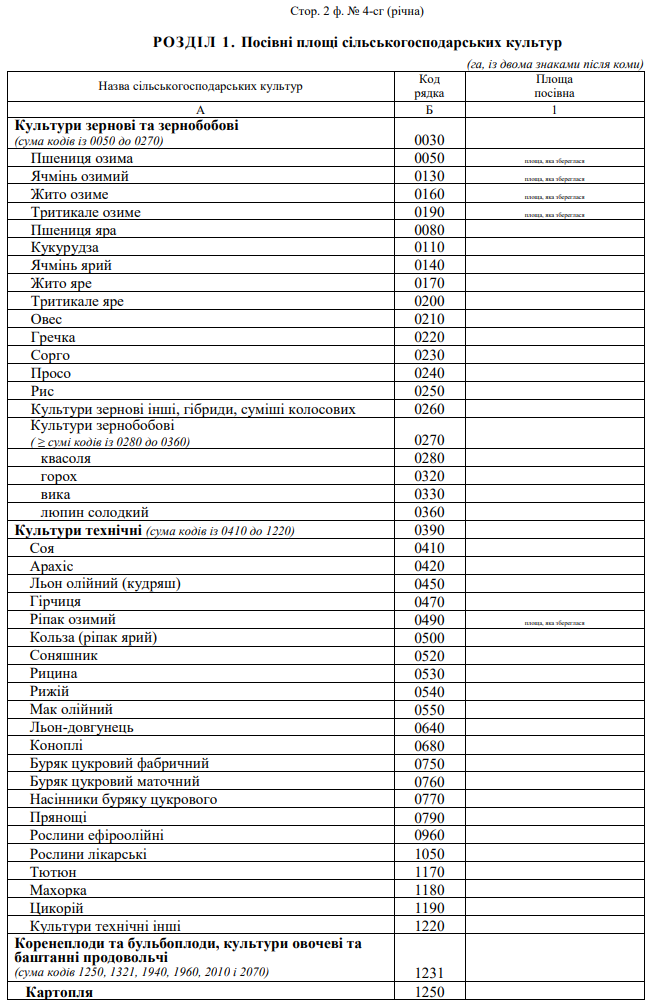 Повна назва бланку: Посівні площі сільськогосподарських культур під урожай 20 __ року (форма №4-сг)
