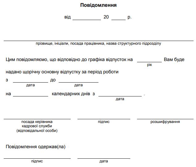 Затверджено бланк "Повідомлення про дату початку відпустки"