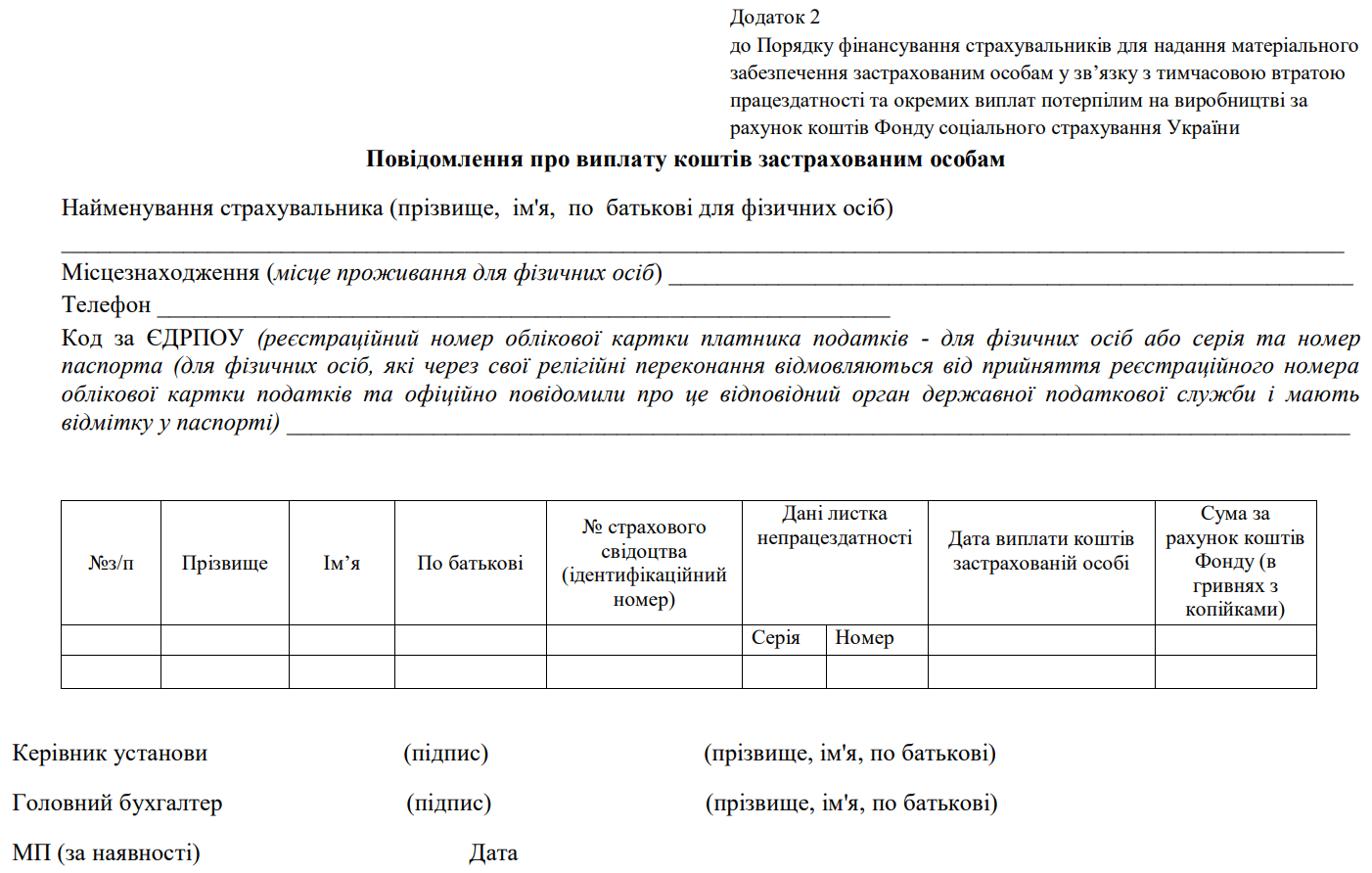 Повна назва бланку: Повідомлення про виплату коштів застрахованим особам