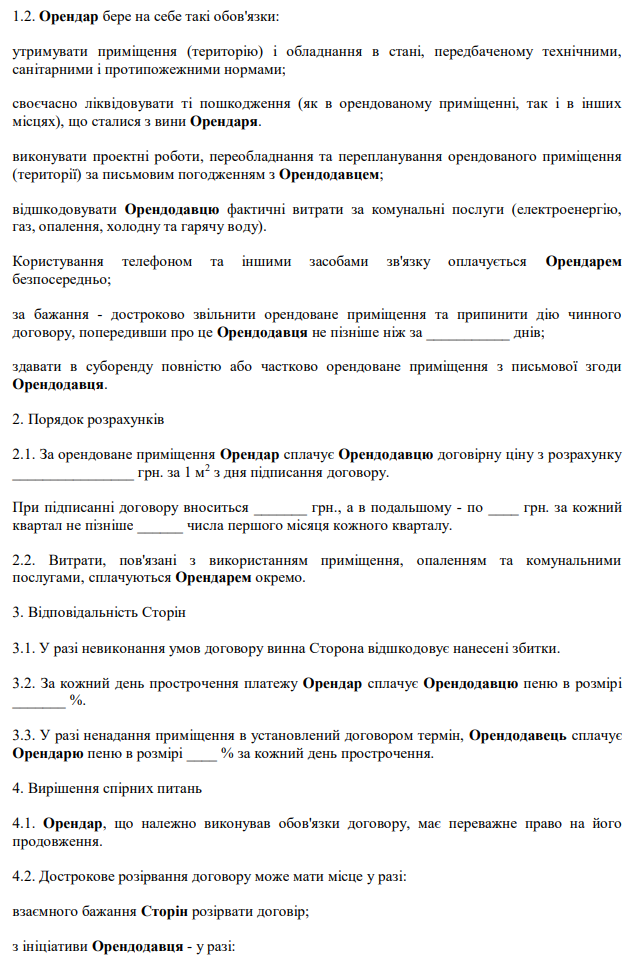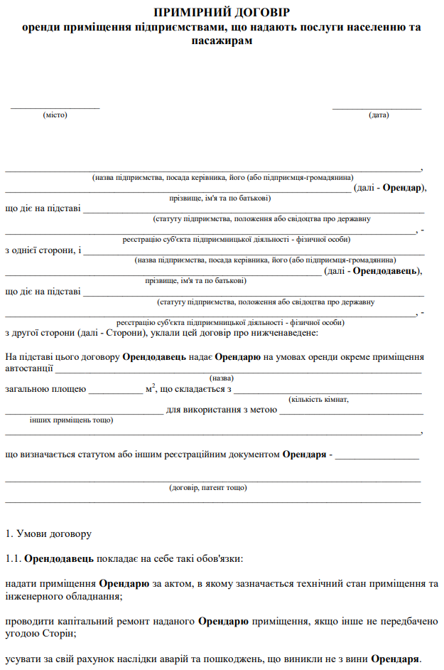 Повна назва бланку: Примірний договір оренди приміщення підприємствами, що надають послуги населенню та пасажирам.