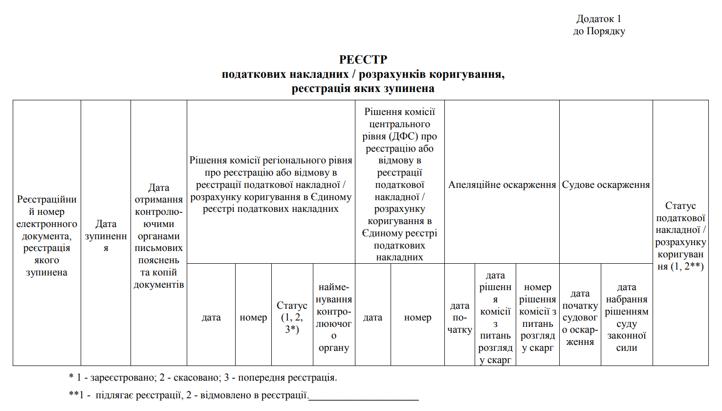 Затверджено бланк "Реєстр податкових накладних / розрахунків коригування, реєстрація яких зупинена"