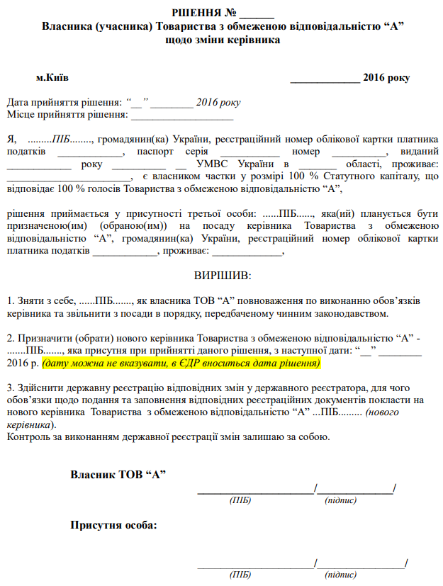 Рішення власника (учасника) ТзОВ щодо зміни керівника (зразок)